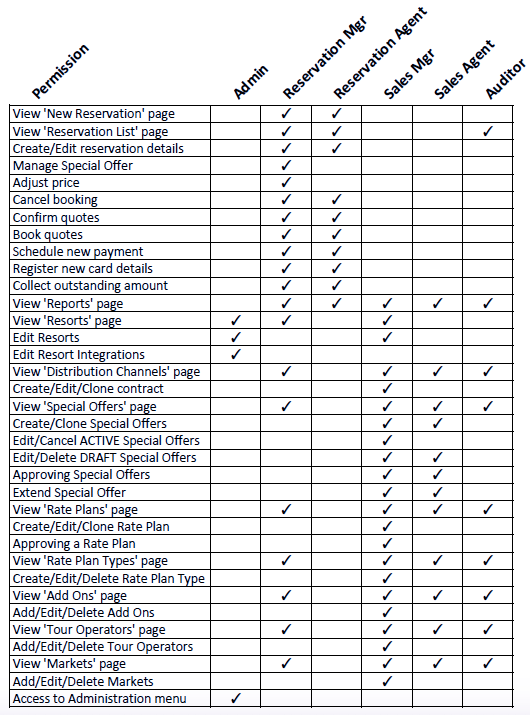 - The permissions for this role are mainly limited to viewing the pricing elements of the organization or resort. The sales agent can view the distribution channels, special offers, rate plans, rate plan types, add-ons, tour operators and markets. This role can also create, approve and extend special offers and edit the draft version only of special offers.