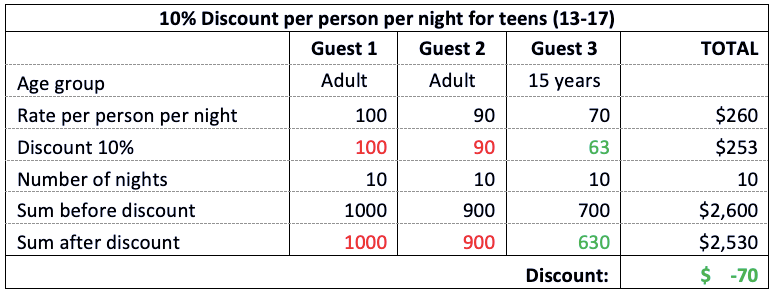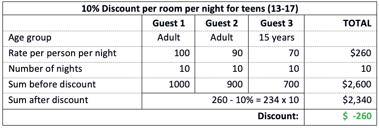 However, if the special offer says “10% discount per room per night for teens 13-17 years of age”, and the booking has 2 adults and 1 child aged 15 years, then the 10% discount would apply to the net rate price for the entire room, including the adults.